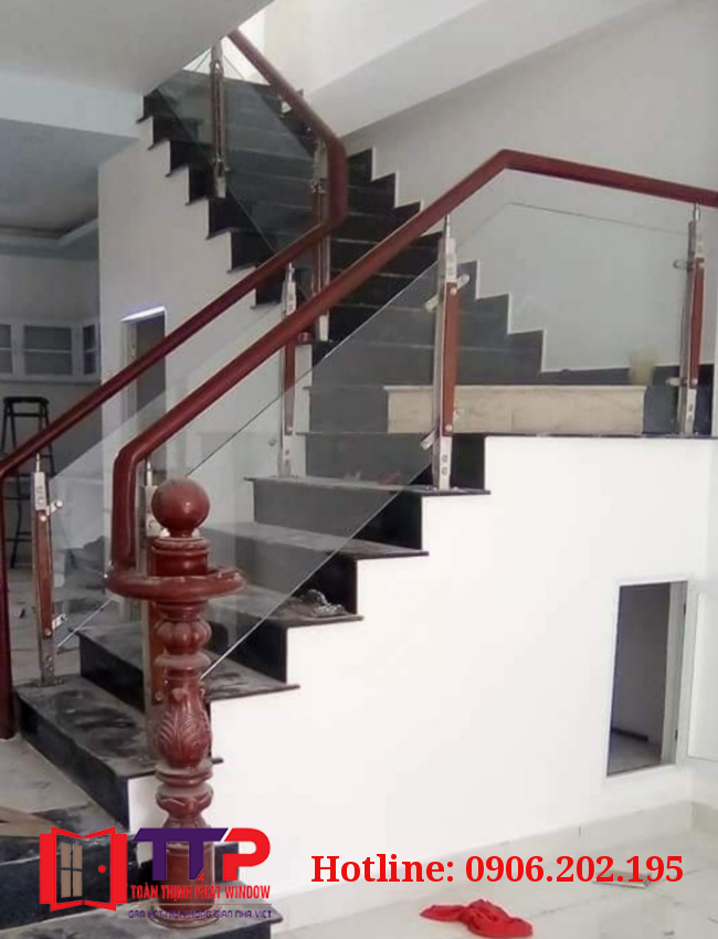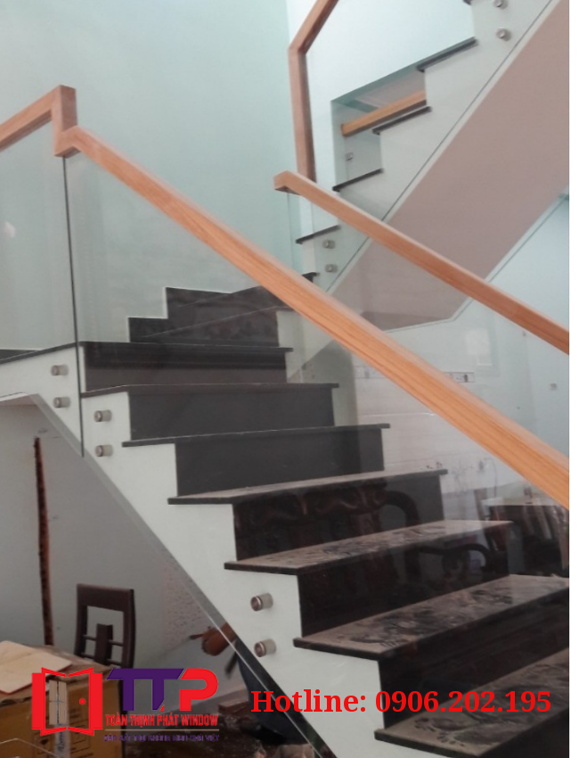 - Cấu tạo: Kính cường lực, trụ là inox, tay vịn gỗ